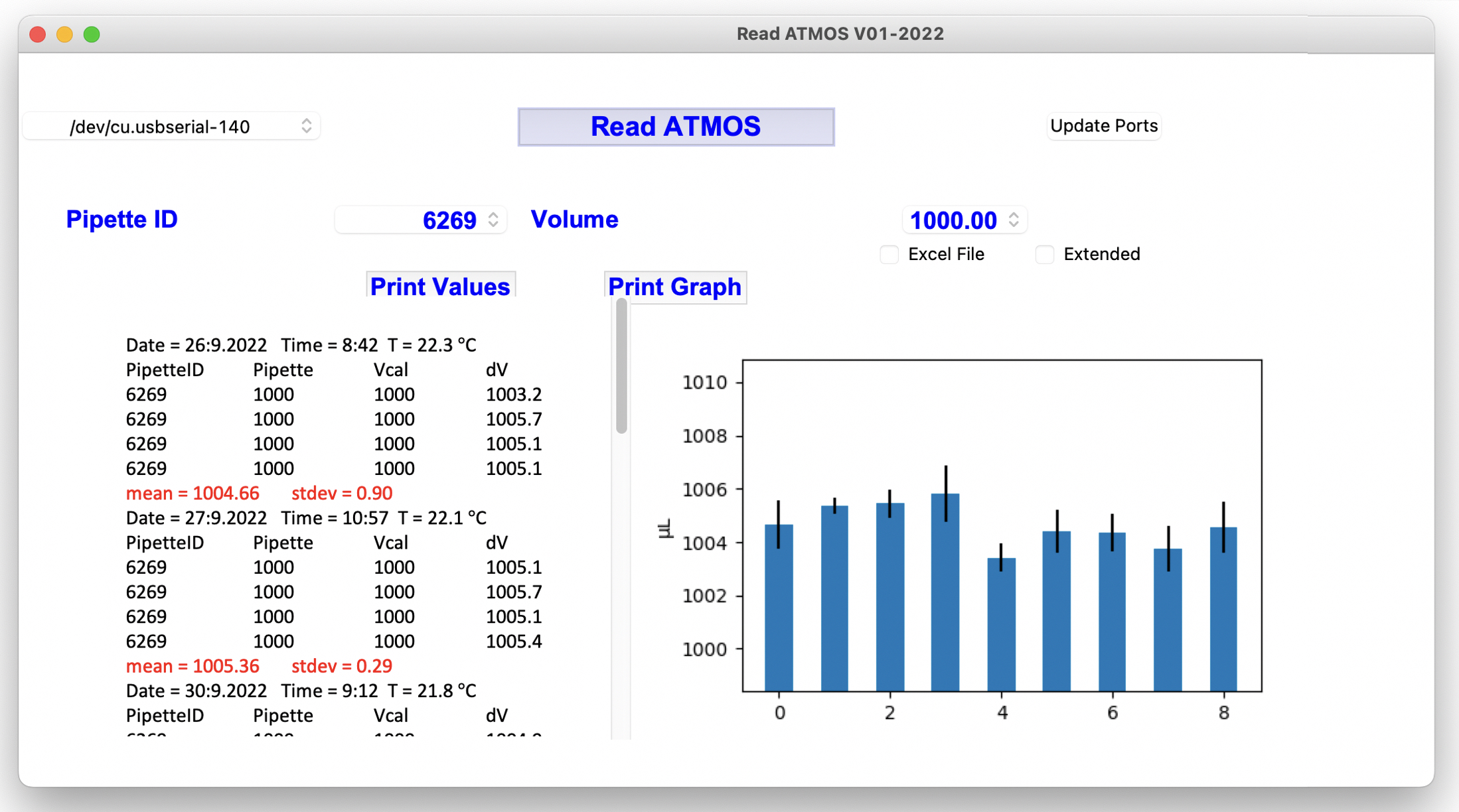 Air-displacement pipettes need to be checked at regular intervals in order to comply with the accuracy standards. The calibration verification normally requires very careful weighting with a laboratory scale. With ATMOS, you can check the accuracy of your pipettes daily, which allows a continuous performance monitoring between the usual calibration procedures.